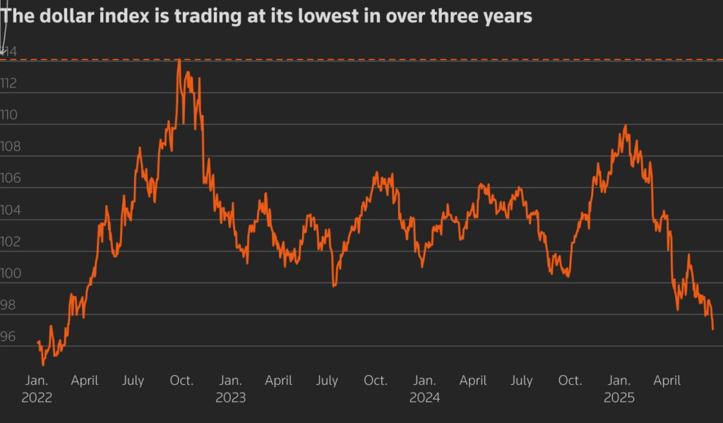 O índice do dólar (.DXY), que mede o desempenho da moeda norte-americana frente a uma cesta de seis moedas, está agora no nível mais baixo desde março de 2022, após a forte queda deste ano.