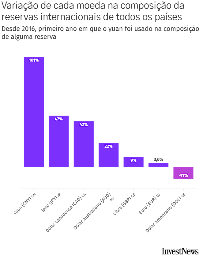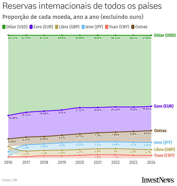 Desde 2015, a fatia dela caiu 23%. Em termos absolutos, o dólar segue líder, claro. 46% das reservas globais estão na moeda americana. Mas há 10 anos eram 60%. E o nível atual é o menor desde 1995.