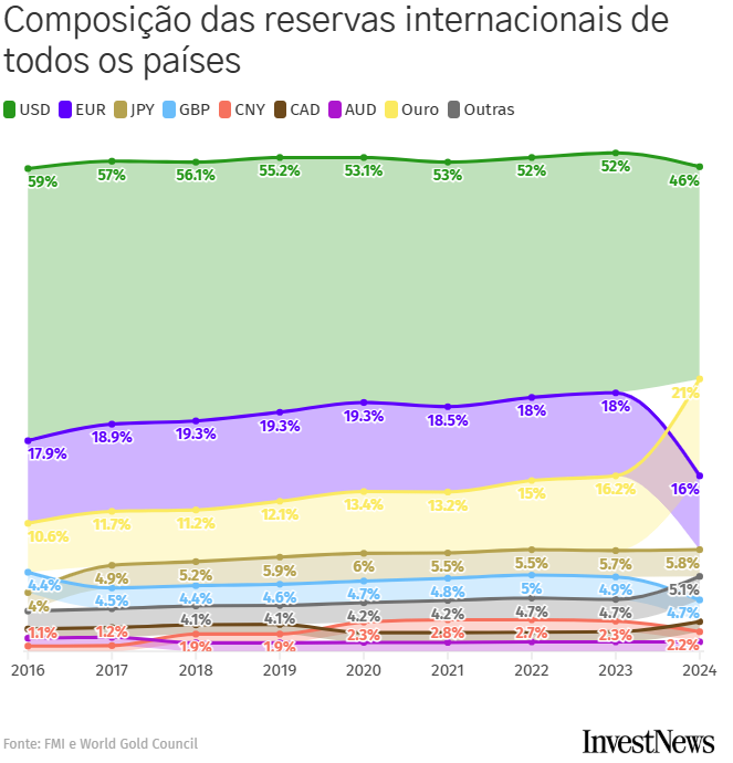 O BC não foge da tendência global. O auge na proporção do dólar veio em 2018, com 89%. De lá para cá, caiu bem, para 78%. E a do ouro subiu 400% nesse intervalo, de 0,7% do total para 3,5%.