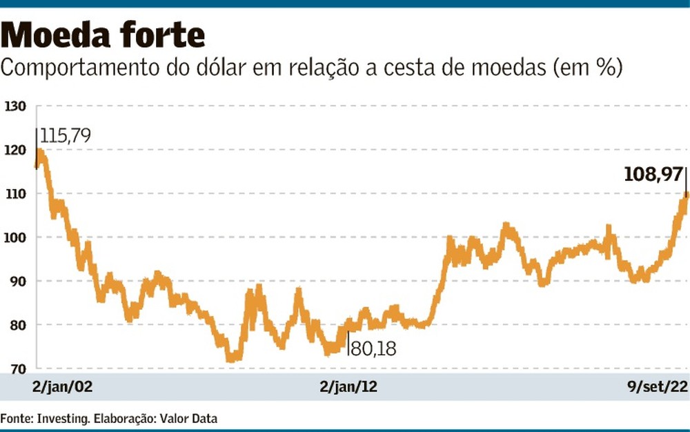 Uma conjunção de fatores mantém o dólar nas alturas neste ano. A moeda americana está nas máximas em duas décadas, num cenário que deve se estender ao longo de 2023, segundo especialistas ouvidos pelo Valor. O cenário reflete o aperto da política monetária dos Estados Unidos neste momento, mas também a fraqueza de outras divisas.