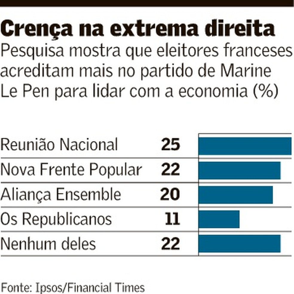 Realizada entre 19 e 20 de junho, a pesquisa mostrou que 25% dos entrevistados têm mais confiança no RN, de Marine Le Pen, para tomar as decisões corretas em questões econômicas, em comparação com os 22% que confiam mais na Nova Frente Popular (NFP) de esquerda e dos apenas 20%, na aliança de Macron.