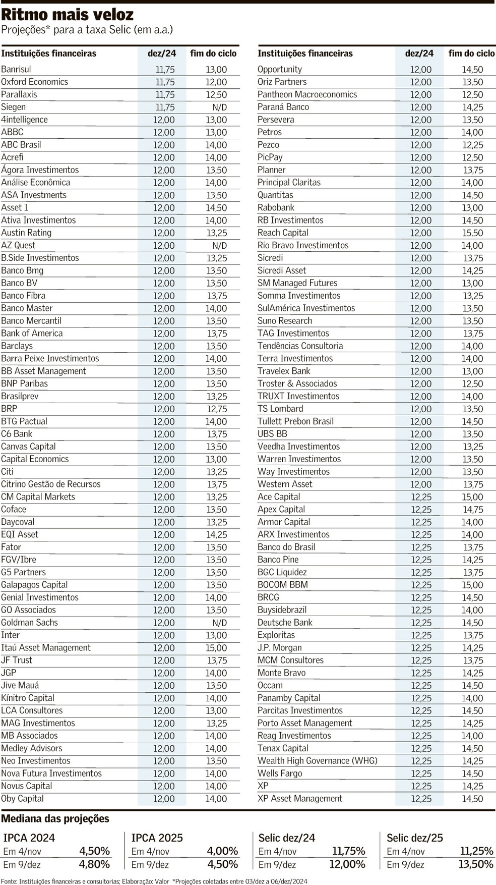 A projeção do Rabobank é de uma alta de 0,75 ponto na reunião de dezembro, outra de igual magnitude na reunião de janeiro e uma elevação residual de 0,25 ponto em março, levando a Selic a 13%. “Essa alta de 0,25 ponto pode ser maior e, portanto, ficamos com um viés de alta no nosso juro terminal neste momento, a depender dos choques e do que podemos acabar vendo de anúncios de política econômica feitos pela Casa Branca e seu impacto em câmbio e inflação aqui no Brasil, assim como o próprio desenrolar do pacote fiscal no Congresso ao longo das próximas semanas”, conclui.