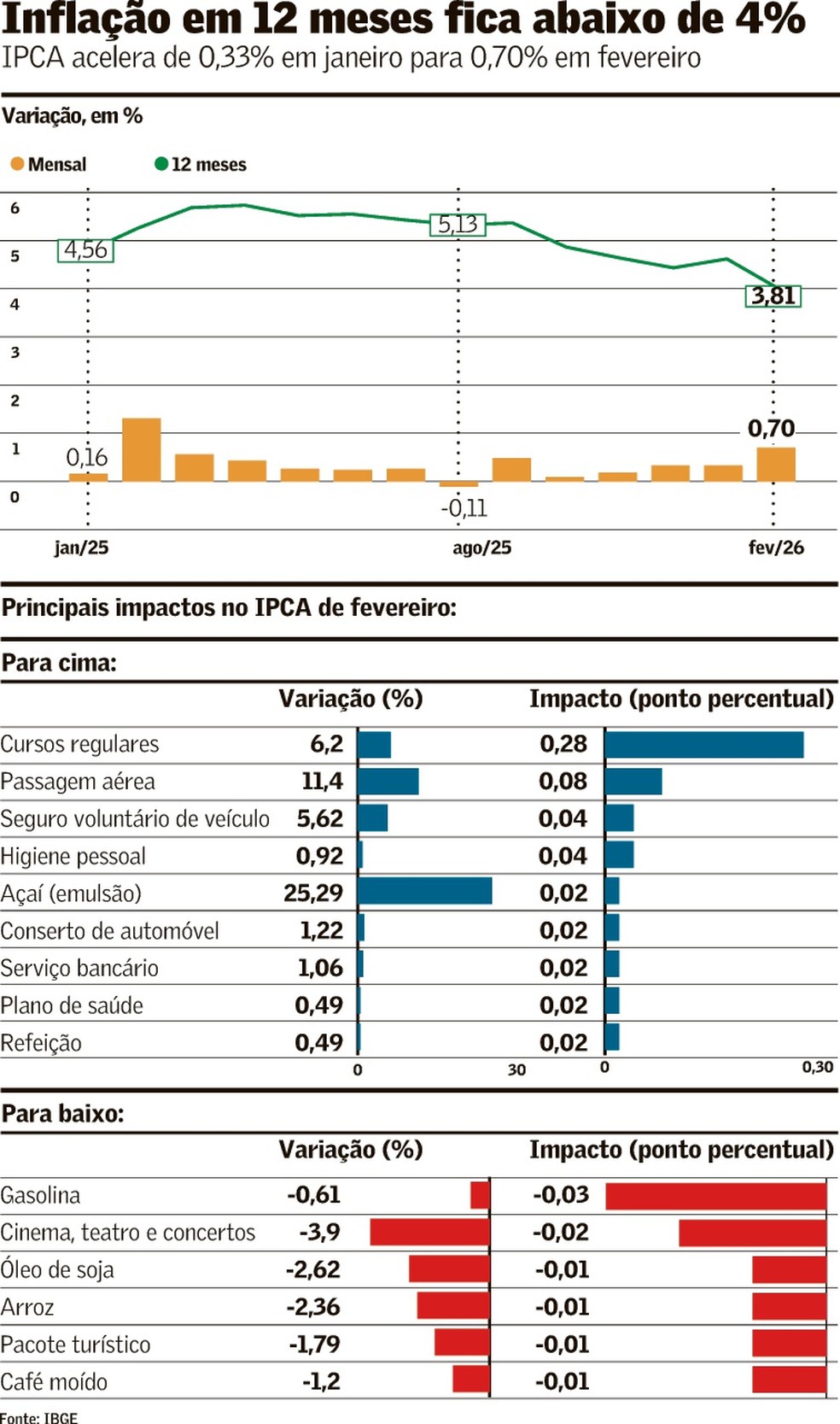 O Índice Nacional de Preços ao Consumidor Amplo (IPCA) subiu 0,70% em fevereiro, acelerando em relação à alta de 0,33% registrada em janeiro. O resultado refletiu principalmente pressões sazonais em educação, enquanto alimentação no domicílio surpreendeu para cima, segundo avaliações de economistas.