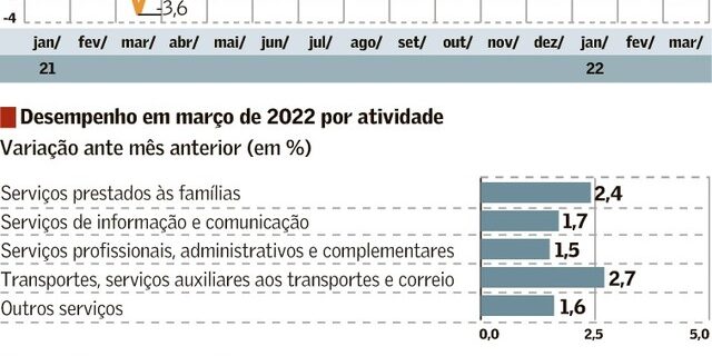 Os dados foram divulgados ontem pelo Instituto Brasileiro de Geografia e Estatística (IBGE), na Pesquisa Mensal de Serviços (PMS) de março. Foi a maior alta para o mês de toda a série histórica da pesquisa, iniciada em 2011, e levou a economia de serviços a uma expansão de 1,8% no primeiro trimestre, ante quarto trimestre de 2021.