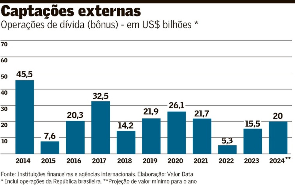 O teste positivo para o interesse dos investidores por emissões de dívida externa de longo prazo de empresas brasileiras selou as expectativas de que o ano será de retomada no mercado de “bonds”. Com um volume captado de US$ 8,8 bilhões do início de janeiro até agora, as estimativas mais conservadoras dos bancos são de que os volumes devem somar, ao menos, US$ 20 bilhões em 2024, o que já representaria um aumento de cerca de 30% em relação ao ano passado.