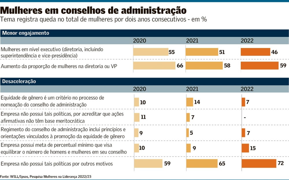 A busca pela equidade de gênero nos conselhos é meta perseguida por 15% das empresas que participaram do estudo “Mulheres na Liderança”, acima dos 9% registrados em 2021. Mas, entre a intenção e a realidade há um hiato. Segundo o levantamento, em 2021, 14% das empresas tinham a equidade de gênero como critério de nomeação de conselheiros. No ano passado, esse percentual caiu para 7%.