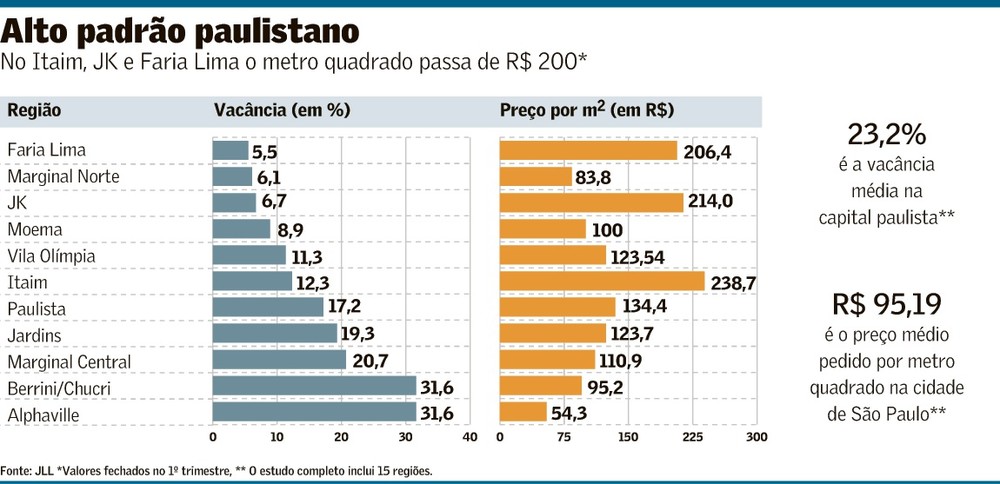 No primeiro trimestre do ano, o mercado de escritórios de alto padrão na cidade de São Paulo terminou com aumento da vacância de 0,6 pontos percentuais, em 23,2%. O desempenho já era esperado, segundo Yara Matsuyama, diretora de locações da JLL, porque o primeiro trimestre é tradicionalmente um dos mais fracos no ano.
