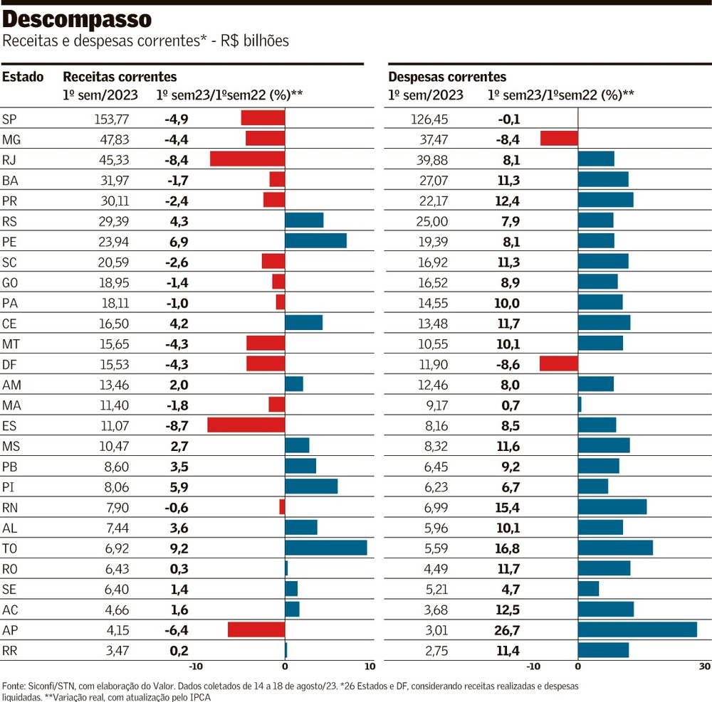 A queda na receita tributária recuou em 15 dos 27 entes em termos reais. As transferências correntes, que incluem o Fundo de Participação dos Estados (FPE), mostram ter esgotado parte da força. Importantes na composição de receitas de alguns Estados, as transferências correntes caíram em 14 dos 27 entes. Total também de 14 Estados teve perda real de receita corrente de janeiro a junho. Em 11 deles o recuo de ingressos aconteceu simultaneamente à alta das despesas correntes. Em todos os 13 entes em que as receitas correntes cresceram os gastos correntes avançaram em ritmo maior. A diferença de taxas chegou a 11,4 pontos percentuais. Os dados foram retirados pelo Valor de relatórios fiscais entregues à Secretaria do Tesouro Nacional. Foram consideradas receitas realizadas e despesas liquidadas. Dados de 2022 foram atualizados pelo IPCA.