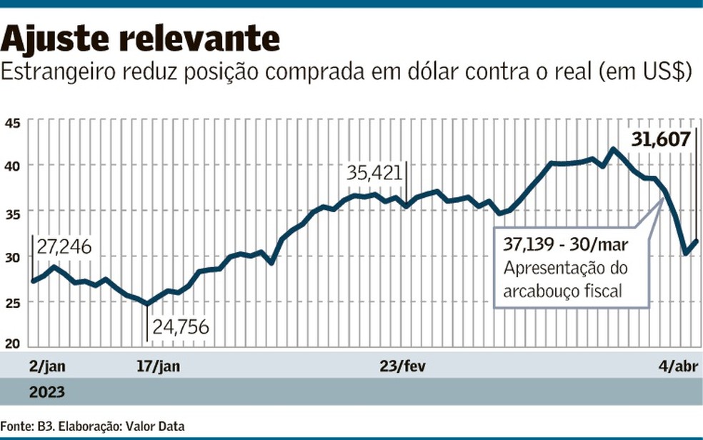 Um movimento que chamou a atenção dos agentes nos últimos dias, inclusive, foi o desmonte nas posições compradas em dólar de investidores estrangeiros. De acordo com dados da B3 sobre as posições em dólar futuro, cupom cambial (DDI) e dólar mini, os não residentes reduziram posição comprada (que aposta na alta do dólar) em US$ 5,532 bilhões entre quinta-feira, quando a proposta de arcabouço fiscal foi revelada, e terça-feira.