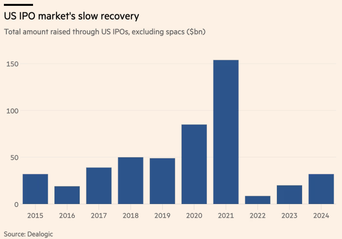 As listagens nos EUA arrecadaram US$ 32 bilhões em 2024, excluindo empresas de aquisição de propósito específico (SPACs), segundo a Dealogic, um aumento de quase 60% em relação a 2023.