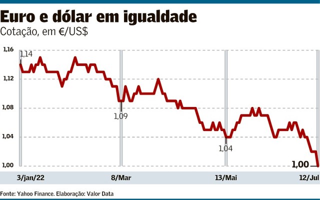 O movimento de queda do euro tem sido rápido e brutal, dado que em fevereiro ainda era negociado em torno de US$ 1,15. O dólar se valorizou com a série de aumentos cada vez maiores nas taxas de juros implementados pelo Federal Reserve (Fed), enquanto a invasão da Ucrânia pela Rússia piorou as perspectivas de crescimento na zona do euro e elevou o custo das importações de energia da região.