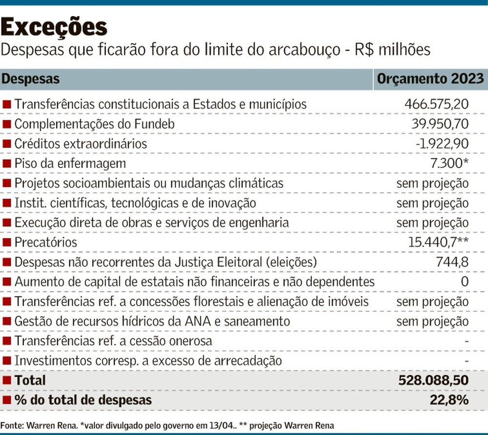 As dotações no Orçamento de 2023 para as mais de dez exceções ao limite de despesas criado no novo arcabouço fiscal somam R$ 528,1 bilhões, segundo levantamento feito pelo ex-diretor executivo da Instituição Fiscal Independente (IFI) Felipe Salto. Representam 22,8% do conjunto de despesas primárias e transferências, informou, em entrevista ao Valor.