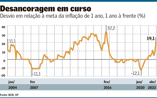 Megale usa como base o desvio em relação à meta das expectativas de inflação anual contando a partir de um ano à frente. Neste mês, o desvio chegou a 19,1%, o maior nível observado desde abril de 2016, o que ajuda a alimentar temores quanto a um processo ainda mais persistente de desancoragem das expectativas inflacionárias.