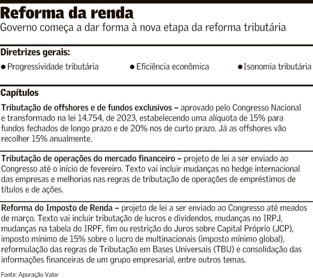 Até o momento, o governo está dividindo a reforma da renda em três capítulos: o primeiro já foi aprovado e sancionado e estabeleceu a tributação sobre offshores e fundos exclusivos. Essa etapa foi antecipada para 2023 para ajudar na meta de zerar o déficit primário neste ano. Já o segundo capítulo tratará da tributação de operações do mercado financeiro, buscando estimular o mercado de capitais. Por ser um tema mais consensual, segundo o governo, será enviado num projeto de lei a parte. O outro projeto trará todos os demais temas da reforma da renda.