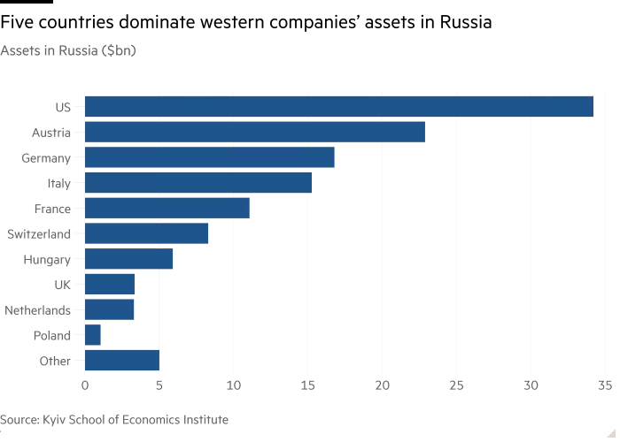Gráfico de barras de Ativos na Rússia (US$ bi) mostrando que cinco países dominam os ativos de empresas ocidentais na Rússia