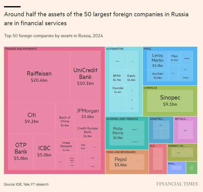 Entre elas estão as filiais russas de bancos como o Raiffeisen, da Áustria, e o UniCredit, da Itália, que geraram lucros significativos durante a guerra e não conseguem repatriá-los devido a uma proibição de pagamento de dividendos. Empresas estrangeiras lucraram US$ 19,5 bilhões na Rússia no ano passado, segundo o KSE Institute.