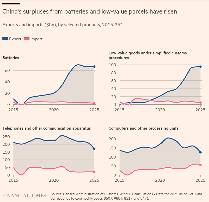 Embora o superávit comercial do país com os EUA esteja mais de US$ 100 bilhões menor neste ano até agora em comparação com o total do ano passado, ele aumentou em uma série de outros destinos, do sudeste asiático à Europa. O resultado é um superávit global em bens histórico, que atingiu US$ 1,08 trilhão em novembro, impulsionado por US$ 3,41 trilhões em exportações e superando todos os totais anuais anteriores.