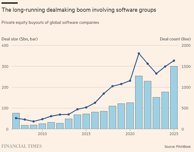 Os deals no setor dispararam de apenas alguns bilhões de dólares por ano antes da crise para centenas de bilhões de dólares a partir de 2020, à medida que firmas rivais de PE tentavam replicar o sucesso de Vista e Thoma.