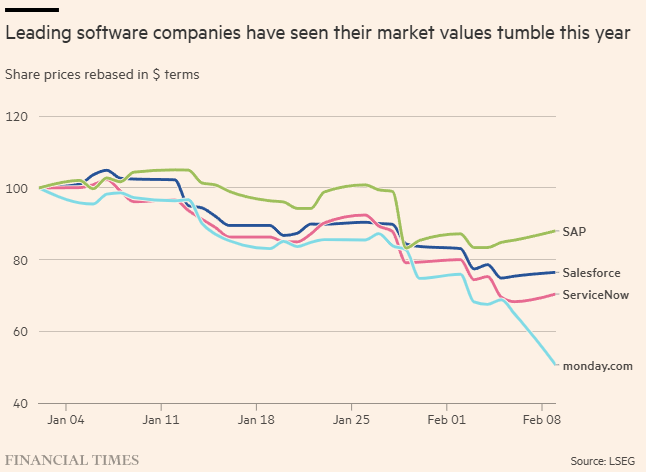 Neste mês, o valor das maiores empresas de software do mundo, como Salesforce e ServiceNow, despencou em um quinto. A angústia dos investidores rapidamente se espalhou para o setor financeiro, já que as ações de grandes grupos de private capital como Blackstone, Ares, KKR e Blue Owl caíram fortemente, sinalizando temores crescentes sobre sua exposição a investimentos em software.