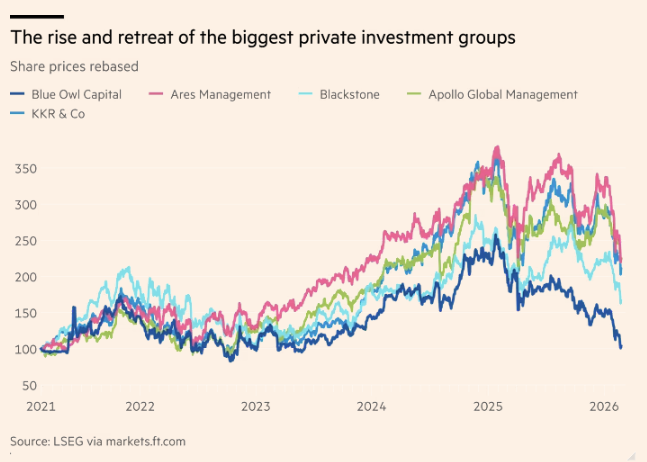 Os problemas da Blue Owl aumentaram as preocupações sobre o setor mais amplo de private capital, com ações de empresas incluindo Blackstone, KKR e Ares em queda de aproximadamente 25% ao longo do último ano.