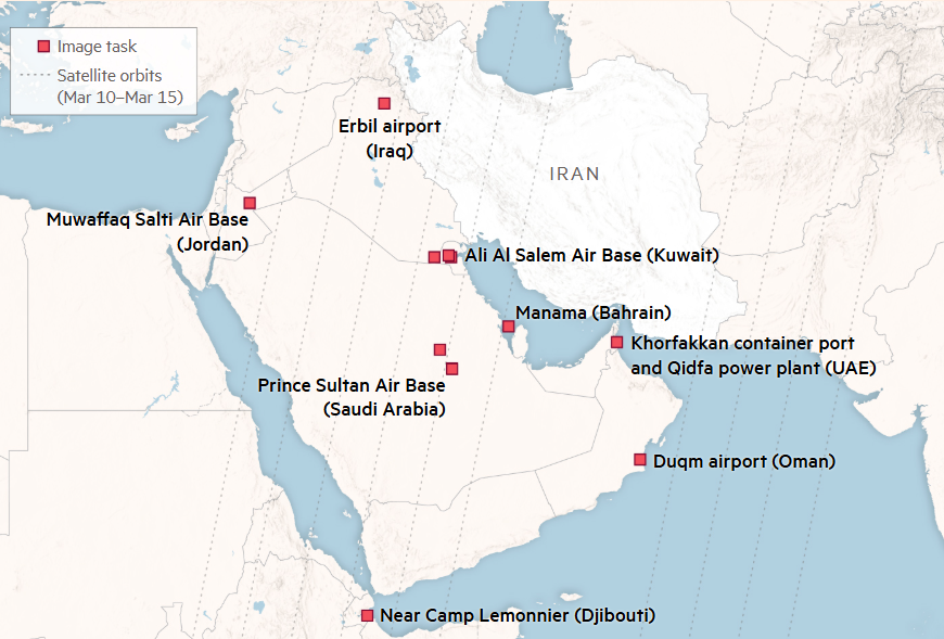 Listas de coordenadas com registro de horário, imagens de satélite e análise orbital mostram que comandantes militares iranianos posteriormente incumbiram o satélite de monitorar locais militares-chave dos EUA. As imagens foram captadas em março, antes e depois de ataques com drones e mísseis contra esses locais.