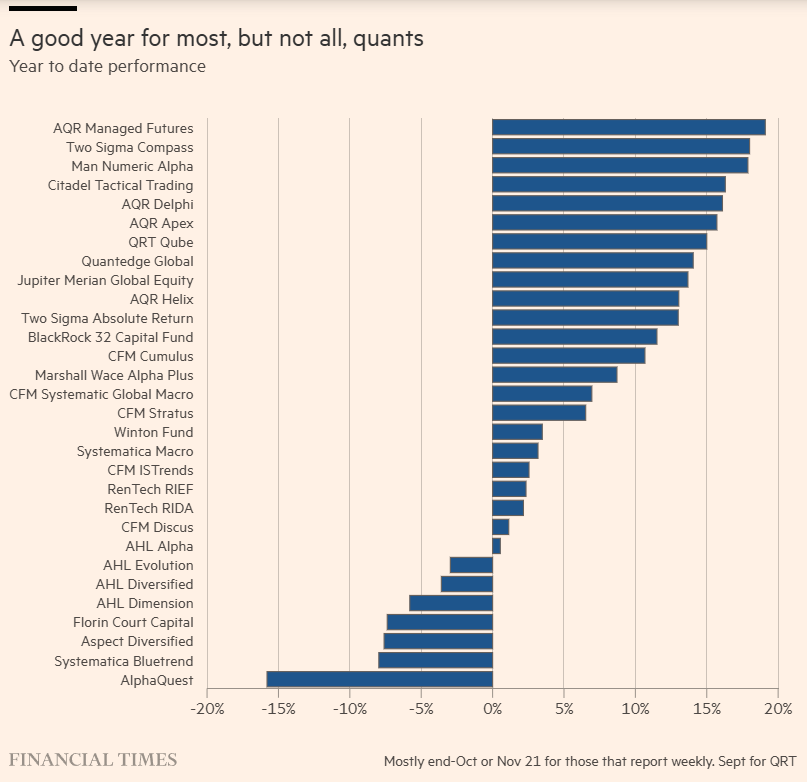 Em outubro, a Renaissance Technologies passou por um pesadelo, com seus dois hedge funds públicos perdendo abruptamente cerca de 15%, antes de dispararem de volta em novembro. Ainda assim, para muitos outros grandes investidores quantitativos, o outono foi, em geral, de águas calmas. Por quê?