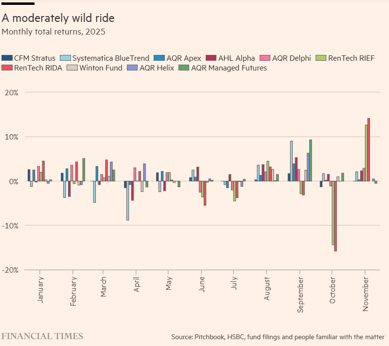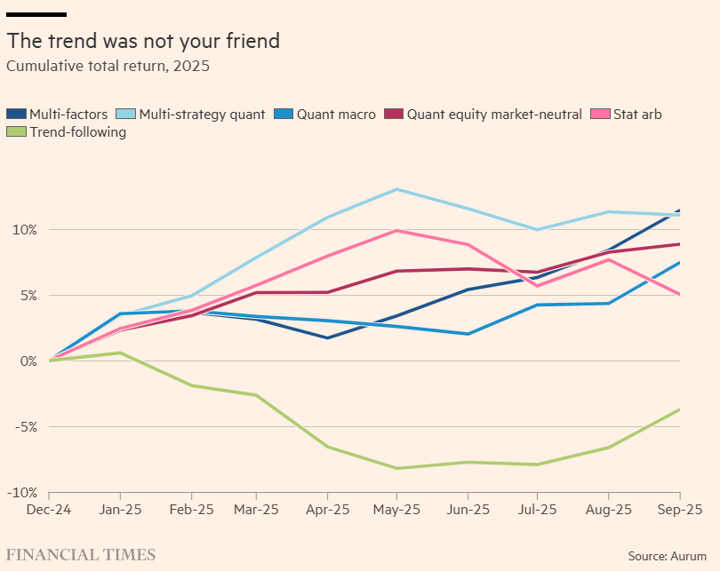 No entanto, se aceitarmos que 2025, de fato, levou a uma quantidade bizarra de divergência na performance até mesmo de estratégias quant semelhantes — como a maioria dos insiders da indústria afirma — o que causou isso? O que poderia fazer com que trend-following, arbitragem estatística, quant multifator ou investimento sistemático long-short market-neutral [long-short neutro ao mercado] saíssem do eixo em momentos diferentes e de maneiras diferentes para pessoas diferentes?