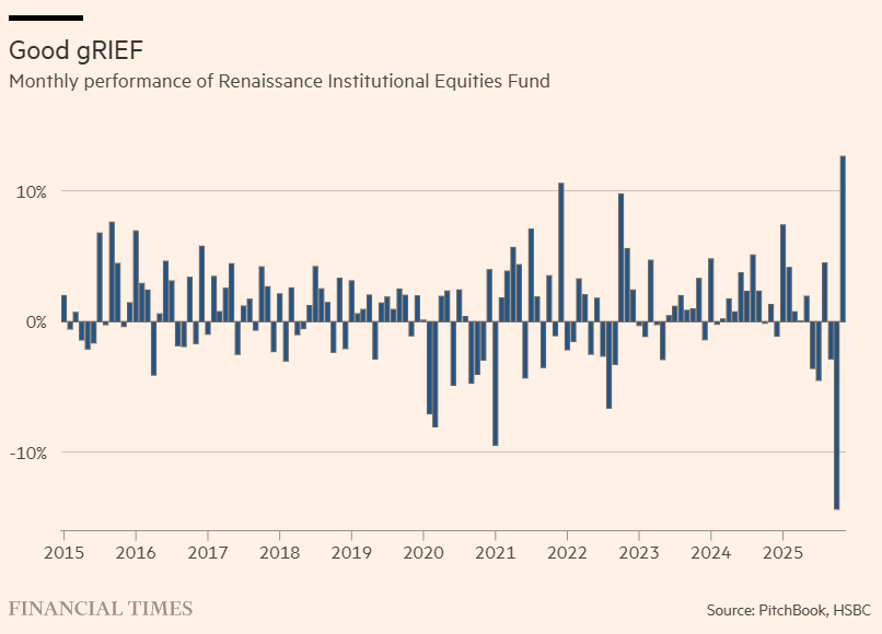 Não sabemos como o lendário fundo Medallion, exclusivo para funcionários da RenTech, se saiu, mas, para seus veículos RIEF e RIDA — que, juntos, administram mais de US$ 20 bilhões — outubro esteve entre os piores meses de todos os tempos. Ambos os fundos se recuperaram em dois dígitos no mês passado, mas ainda caminham para mais um ano fraco.