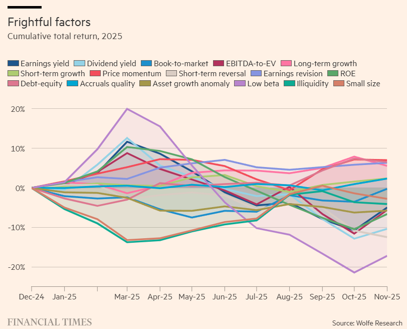Fatores de investimento são um proxy imperfeito para uma indústria ampla e diversa, mas é revelador que nove dos 16 fatores quant mais amplamente acompanhados pela Wolfe Research perderam dinheiro este ano, e quase todos eles foram muito mais voláteis do que o usual.