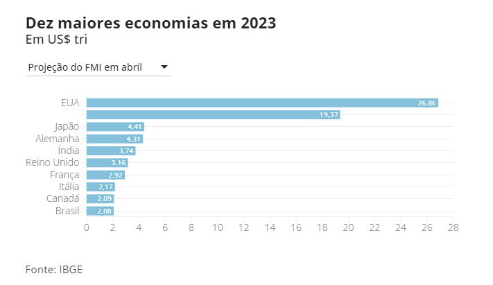O Brasil foi a 11ª maior economia global no ano passado e a previsão do FMI em abril era que o país ganharia uma posição neste ano e chegaria ao nono lugar no ano que vem – a última vez que o PIB brasileiro ficou nessa posição foi em 2019, antes da pandemia.