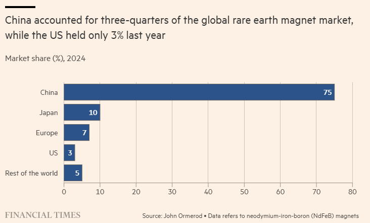 EUA, Europa e Japão correm para desenvolver uma cadeia de suprimentos de minerais e ímãs fora da China, críticos para tecnologias que vão de smartphones a veículos elétricos e caças. Atualmente, a indústria ocidental é quase totalmente dependente da China para terras raras.