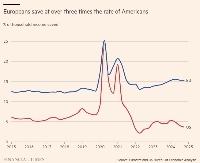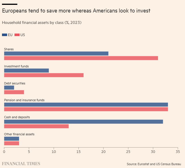 O resultado é que, embora os europeus economizem 15% da renda familiar — mais de três vezes o que os americanos conseguem — essa poupança é mantida, na maioria, em produtos de baixo risco, como contas de poupança. Entre 2015 e 2021, os lares da UE mantiveram 32% de seus ativos financeiros em dinheiro e depósitos, contra apenas 13% das famílias dos EUA, que colocam quase metade de sua riqueza financeira em ações e fundos de investimento.