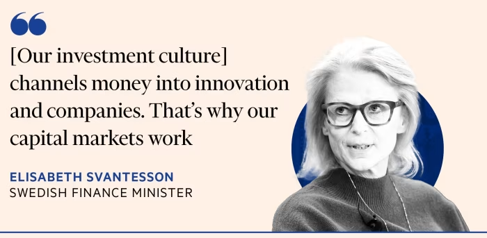 “Chamamos isso de poupança, mas na verdade é investimento”, diz a ministra das Finanças da Suécia, Elisabeth Svantesson. “É algo profundamente cultural. Todos, da esquerda à direita, entendem isso. E canaliza dinheiro para inovação e empresas”, ela acrescenta. “É por isso que nossos mercados de capitais funcionam.”