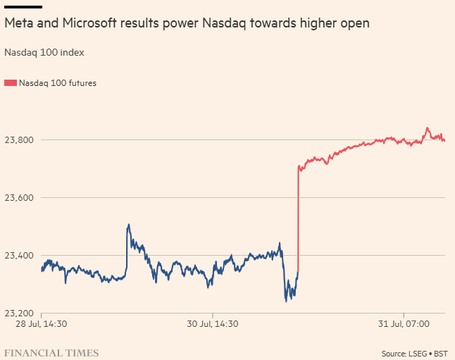 As ações de tecnologia dos Estados Unidos estavam prestes a abrir em novas máximas históricas nesta quinta-feira, à medida que os lucros extraordinários da Microsoft e da Meta permitiram que os investidores ignorassem preocupações com o crescimento econômico dos EUA e alertas sobre uma bolha no mercado de ações.