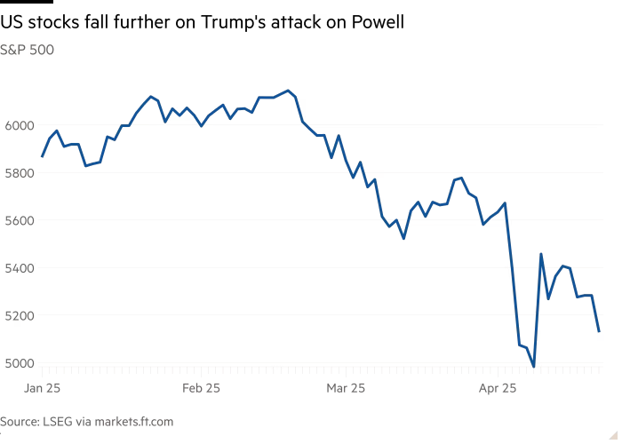 As ações de Wall Street e o dólar caíram em meio à crescente incerteza sobre a economia dos EUA, à medida que o presidente Donald Trump renovou seus ataques ao presidente do Federal Reserve, Jay Powell.