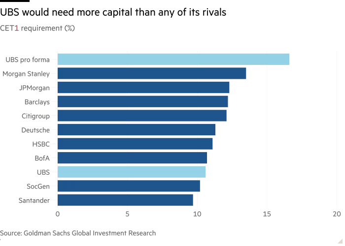 Analistas do Goldman Sachs disseram que o aumento proposto na razão CET1 do UBS “prejudicaria significativamente [sua] competitividade em relação a grandes pares internacionais”.