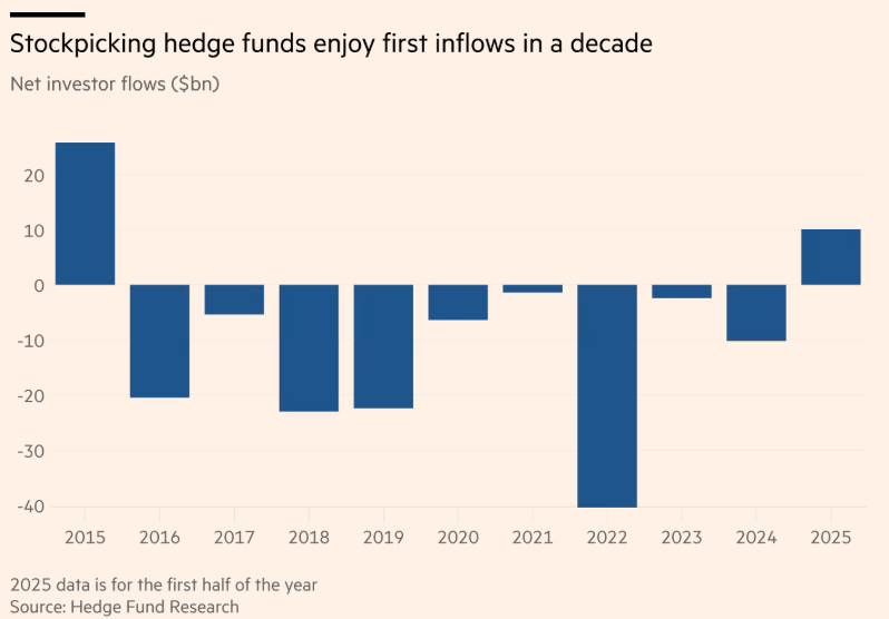 Os fundos de hedge long-short haviam sofrido nove anos consecutivos de resgates, por não entregarem a prometida proteção superior aos investidores durante períodos de queda — em especial no forte sell-off [queda acentuada] das ações em 2022 — apesar das altas taxas cobradas. Sendo um dos setores mais antigos e conhecidos da indústria, foram, nos últimos anos, ofuscados pelos gigantes fundos multi-manager, que distribuem o capital dos clientes em uma variedade de estratégias.