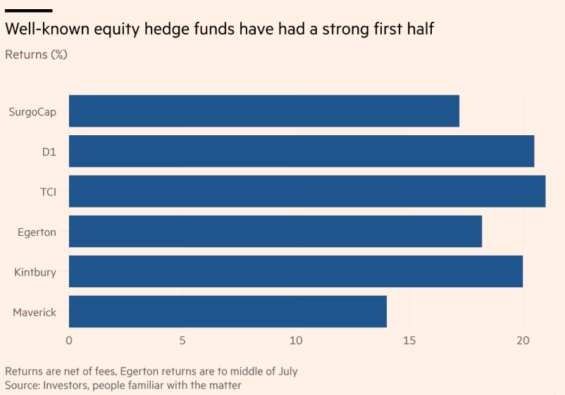 As entradas aconteceram enquanto alguns dos maiores nomes da indústria — incluindo o TCI de Chris Hohn e o Egerton de John Armitage — registraram retornos de dois dígitos nos seis meses até junho, segundo pessoas familiarizadas com os números, e alocadores de ativos buscaram alternativas à exposição ampla via índices em meio a grandes oscilações de mercado.