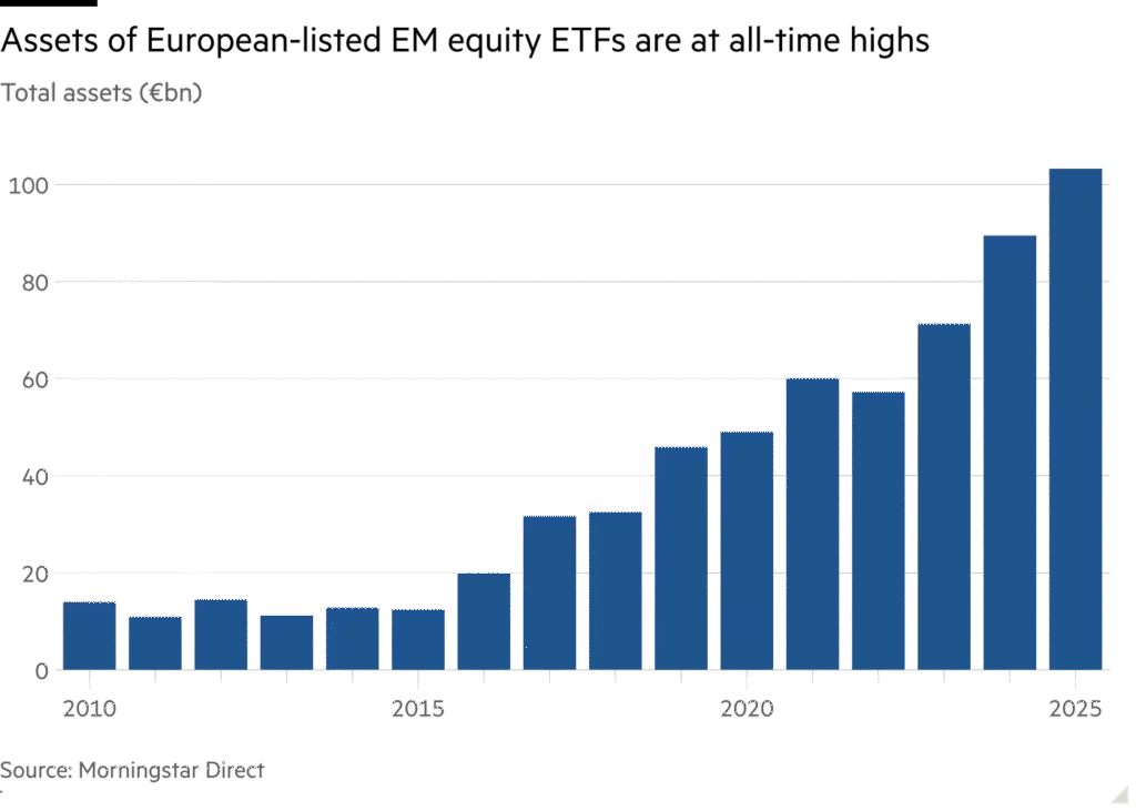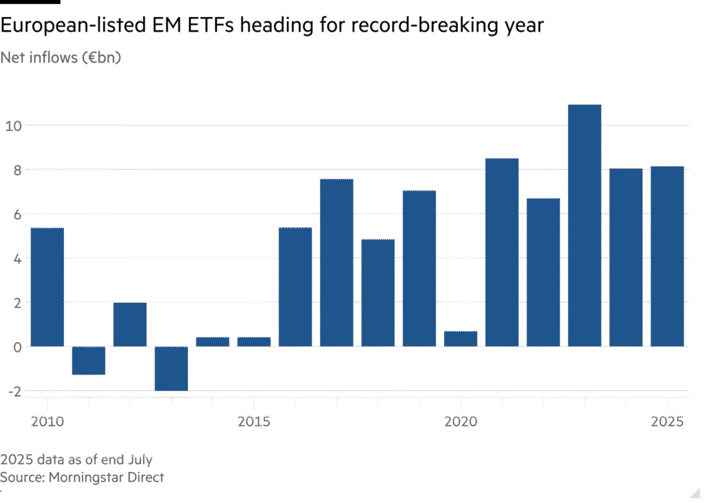 Os ETFs de ações de EM listados na Europa — incluindo aqueles listados no Reino Unido — captaram €8,1 bilhões em entradas líquidas nos primeiros sete meses do ano, ligeiramente acima do total anual de 2024 e a caminho de superar o recorde de €10,9 bilhões registrado em 2023, segundo dados da Morningstar Direct.