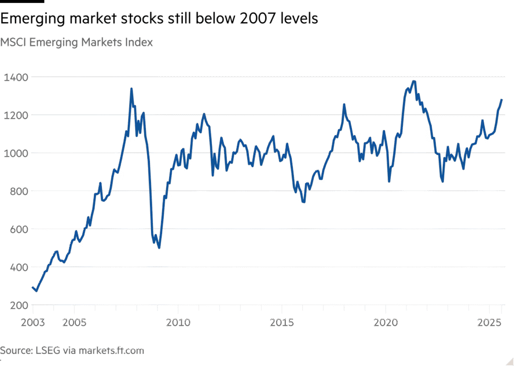 O rali dos EM vem após anos de desempenho fraco. O índice de referência ainda está abaixo do patamar atingido em 2007. Em contraste, o S&P 500 quadruplicou desde então e o índice europeu subiu quase 40%.