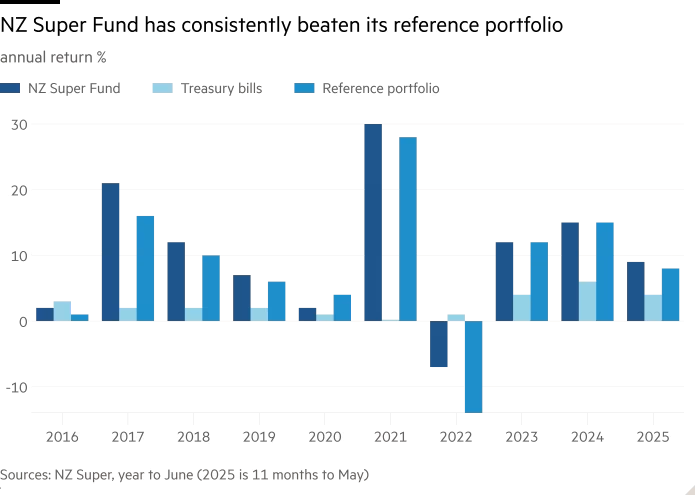 Segundo a plataforma de dados Global SWF, o NZ Super Fund — que começou a investir em 2003 e emprega 79 pessoas em sua equipe de investimentos em Auckland — foi o fundo soberano de melhor desempenho nos últimos 10 e 20 anos, com retornos anualizados de mais de 10%.