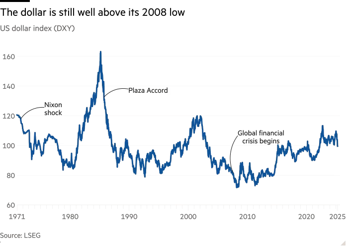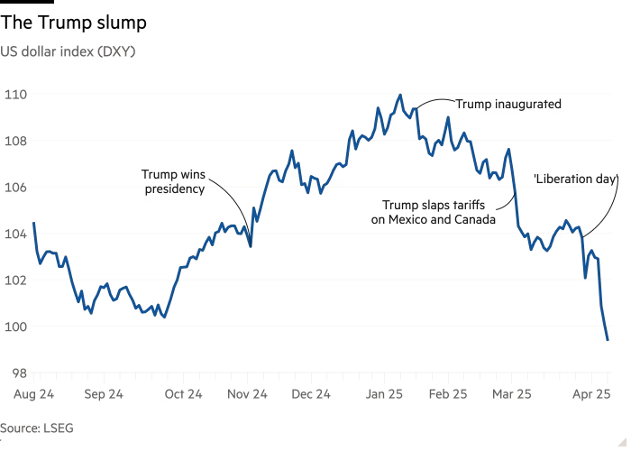 Intencionalmente ou não, quase todas as ações tomadas pelo governo Trump em seus três primeiros meses minaram o suporte ao dólar. Na semana passada, o índice DXY — que mede a força do dólar frente a uma cesta das principais moedas — caiu 2,8%, sua sétima pior semana nas últimas três décadas. E continuou caindo esta semana, acumulando uma queda de 8,2% em 2025.