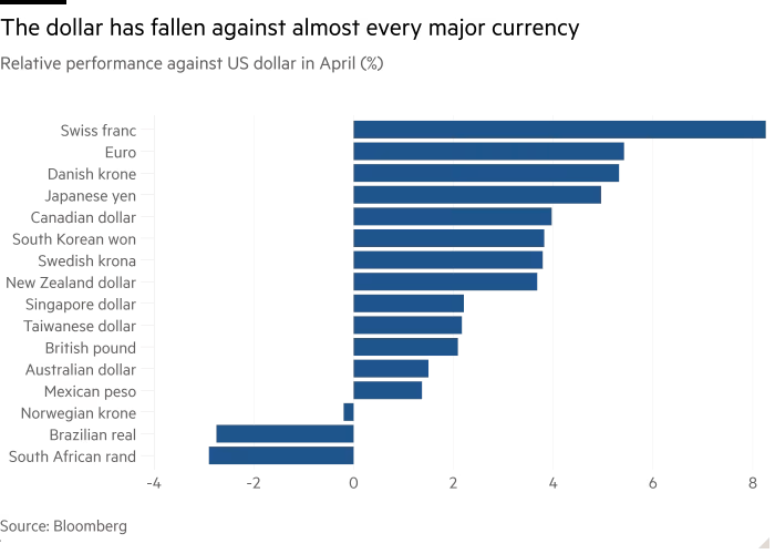 “A guerra comercial é apenas o mais recente exemplo do desprezo deste governo pelo resto do mundo”, diz Mark Sobel, presidente do OMFIF nos EUA (um think tank financeiro) e ex-funcionário sênior do Tesouro americano. “Ser um parceiro e aliado confiável é um pilar fundamental da dominância do dólar — e isso foi jogado ao vento.”