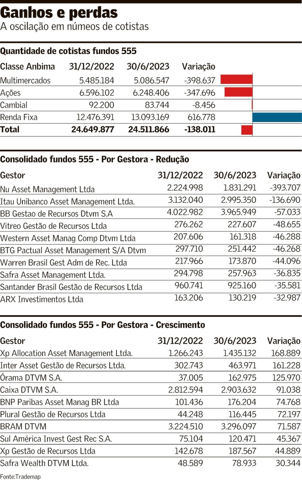 Os dados diferem dos apresentados pela Anbima, que representa o mercado de capitais e de investimentos, que agrega também os fundos estruturados. O mapeamento da Trademap contempla apenas portfólios debaixo da antiga Instrução 555 da Comissão de Valores Mobiliários (CVM) – revisada na 175, que começa a valer em outubro -, explica Einar Rivero, que compilou os números da base da Comissão de Valores Mobiliários (CVM). Tanto em um caso quanto outro, pode haver duplicidade de CPFs ou CNPJs se o mesmo investidor tiver aplicação em mais de um produto.