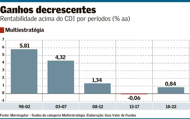 Um outro exercício feito pelo economista Marcelo d’Agosto, colunista e coordenador do Guia Valor de Fundos, coloca numa linha do tempo o que ocorreu com o setor em intervalos de cinco anos. Se entre 1998 e 2002 o retorno excedente ao CDI chegou a 5,81%, na média, no recorte mais atual, entre 2018 e o fim de junho de 2022, estava em 0,84%. No período entre 2003 e 2007, ficou em 4,32%, caindo a 1,34% entre 2008 e 2012 e ficando negativo entre 2013 e 2017. Os números foram extraídos da base da Morningstar e a performance média representa tudo o que o provedor coloca na caixa multiestratégia.