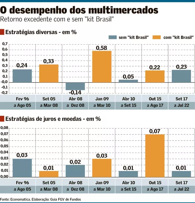 Os resultados foram calculados pelo professor William Eid Junior, da Fundação Getulio Vargas (FGV), com base numa amostra de 535 multimercados abertos à captação do Guia de Fundos FGV (base Economatica) até julho de 2022. O estudo mostra que em alguns períodos, em particular, o desempenho do “kit Brasil” – com alta da bolsa, queda dos juros e valorização do real – explica a performance: entre setembro de 2005 e março de 2008; entre janeiro de 2009 e março de 2010; e entre outubro de 2015 e agosto de 2017.