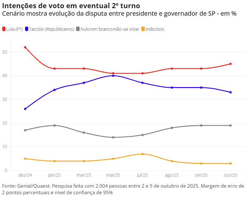 Na simulação de primeiro turno com os dois concorrendo, Lula tem agora uma distância de 21 pontos para Tarcísio. Em setembro, eram 18 pontos. O governador de São Paulo sofreu prejuízo de imagem desde o início da ofensiva de Eduardo Bolsonaro nos Estados Unidos e acumulou desgastes por defender o tarifaço do presidente Donald Trump e por subir o tom no embate com o STF, em defesa de Jair Bolsonaro.