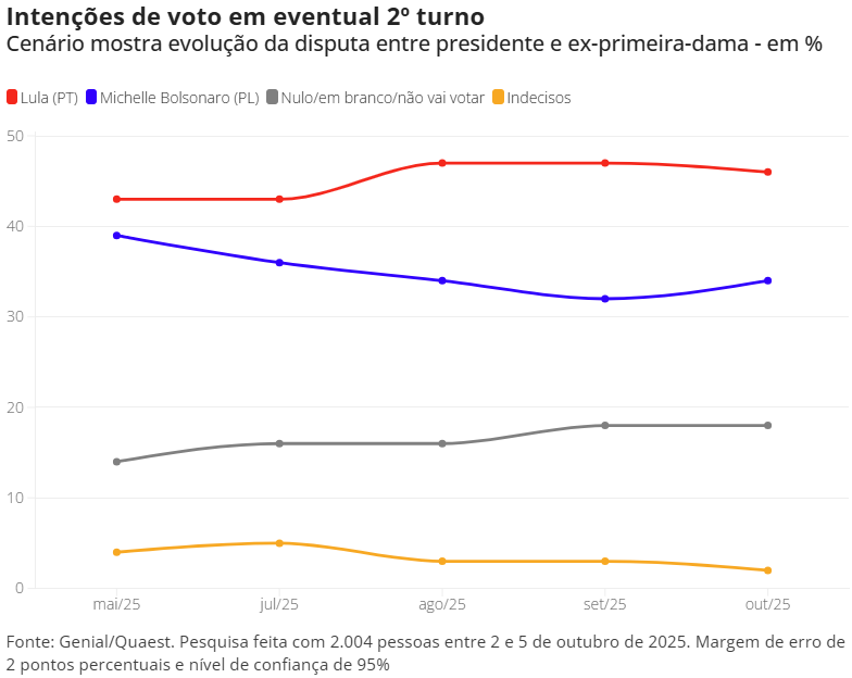 Ainda nas simulações de segundo turno, Lula possui 46%, à frente de Jair Bolsonaro, com 36% (diferença de 10 pontos). Contra Michelle, Lula registra 46%, e a ex-primeira-dama alcança 34% (diferença de 12 pontos).
