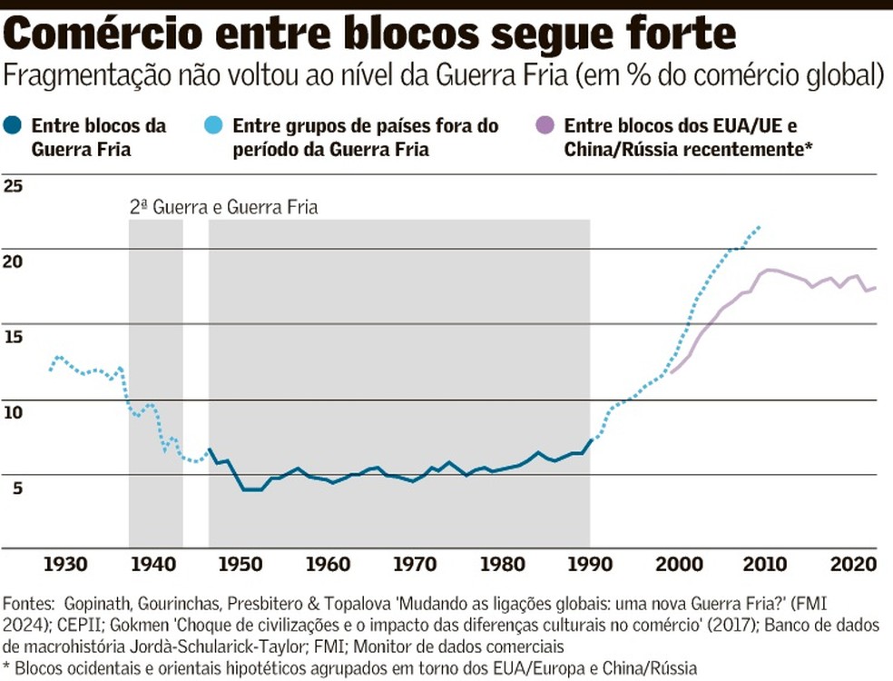 Economistas da OMC dividiram os países do mundo em dois blocos geopolíticos, um centrado nos EUA e o outro na China, e estimaram que, desde a invasão da Ucrânia pela Rússia, o comércio de bens entre ambos cresceu apenas 4,2%, menos que dentro deles. Estudos do Fundo Monetário Internacional (FMI) também detectaram menos comércio e investimento estrangeiro direto entre os blocos geopolíticos do que dentro deles, mas descrevem as diferenças até agora como relativamente pequenas.