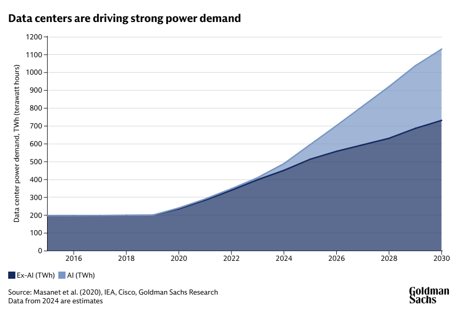 Após permanecer praticamente estável por anos, a demanda dos data centers por energia deve acelerar 175% até 2030 (em relação aos níveis de 2023), de acordo com a Goldman Sachs Research. Isso equivale ao surgimento de mais um país entre os 10 maiores consumidores de energia do mundo.